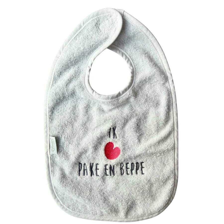 Dit witte slabbetje heeft de geborduurde tekst “Ik hâld fan pake en beppe” doormiddel van een lief rood hartje, wat in het Nederland betekent “Ik hou van opa en oma”.